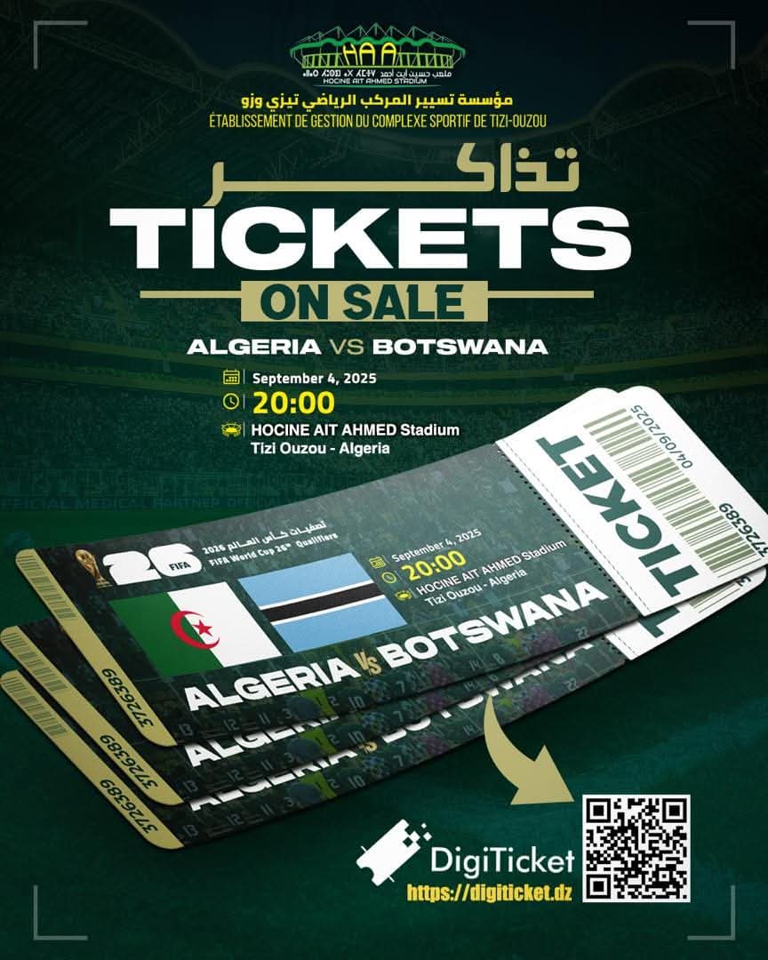 أعلنت إدارة ملعب حسين آيت أحمد بتيزي وزو رسمياً عن موعد انطلاق بيع تذاكر مباراة المنتخب الوطني الجزائري أمام نظيره البوتسواني، المقررة ضمن الجولة السابعة من تصفيات كأس العالم 2026 يوم الخميس 4 سبتمبر 2025 على الساعة 20:00. وبحسب البيان الرسمي، ستنطلق عملية بيع التذاكر يوم الاثنين 1 سبتمبر 2025 على الساعة 12:00 زوالاً عبر المنصة الرقمية الرسمية “ديجي تيكات” (تذكرتي) على الرابط الإلكتروني https://egcsto.digiticket.dz/.