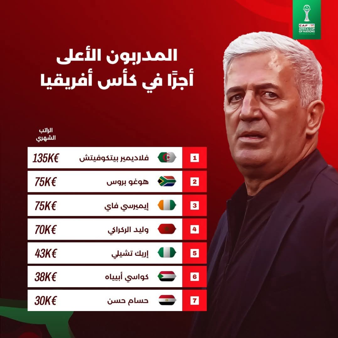 تضع تقارير متعددة فلاديمير بيتكوفيتش في المركز الأول كأعلى مدرب أجرًا في البطولة براتب شهري يقدر بـ135 ألف يورو، وهو رقم يجعله في قمة سلم الرواتب بين مدربي المنتخبات الإفريقية أيضًا.وتربط بعض التحليلات هذا الرقم بفكرة “شراء الخبرة”؛ فالاتحاد الجزائري راهن على مدرب بمرجعية أوروبية وتجارب على مستوى عالٍ، ما يرفع تلقائيًا سقف التوقعات من حيث النتائج والهوية والقدرة على إدارة الضغوط في المواعيد الكبرى.