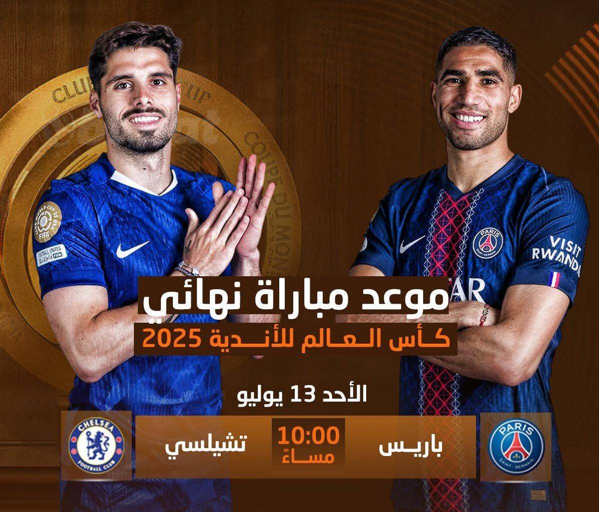 يواجه الفريقان العملاقان تشيلسي وباريس سان جيرمان في نهائي كأس العالم للأندية 2025، المقرر إقامته اليوم الأحد 13 يوليو 2025، الساعة 19:00 بتوقيت غرينتش (21:00 بتوقيت وسط أوروبا) على ملعب ميتلايف في نيوجيرسي، الولايات المتحدة. المباراة تُعد حدثًا رياضيًا عالميًا كبيرًا، وستُنقل عبر مجموعة واسعة من القنوات التلفزيونية والمنصات الرقمية.