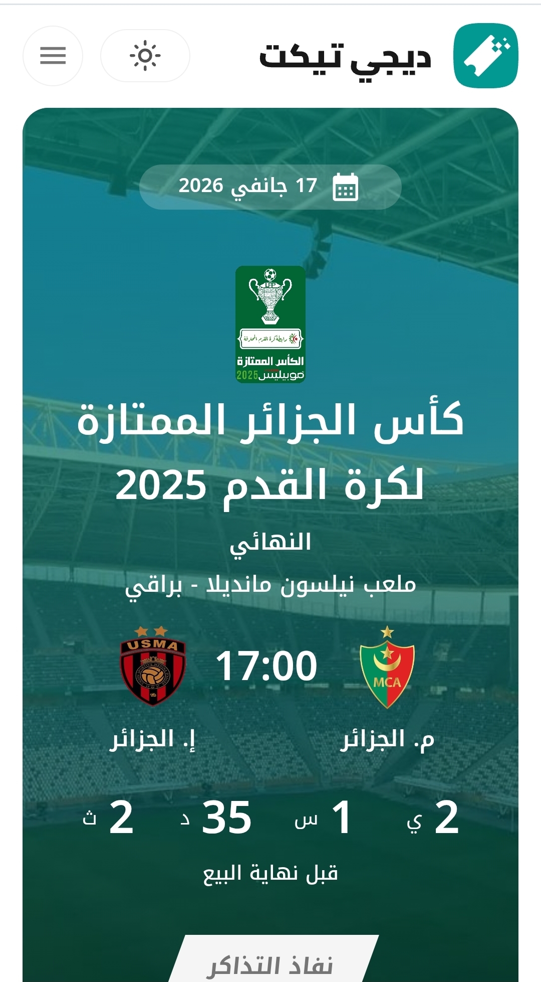 تُقام مباراة كأس السوبر بين مولودية الجزائر واتحاد العاصمة يوم السبت 17 جانفي 2026 انطلاقًا من الساعة 17:00، على أرضية ملعب نيلسون مانديلا، في موعد يُنتظر أن يستقطب اهتمامًا واسعًا بالنظر إلى قيمة الديربي وحساسية اللقب في بداية السنة الكروية. اختيار هذا الملعب يمنح المنظمين هامشًا أكبر من حيث القدرة الاستيعابية والتنظيم اللوجستي، خاصة مع اعتماد بيع التذاكر عبر منصة رقمية بدل البيع التقليدي.