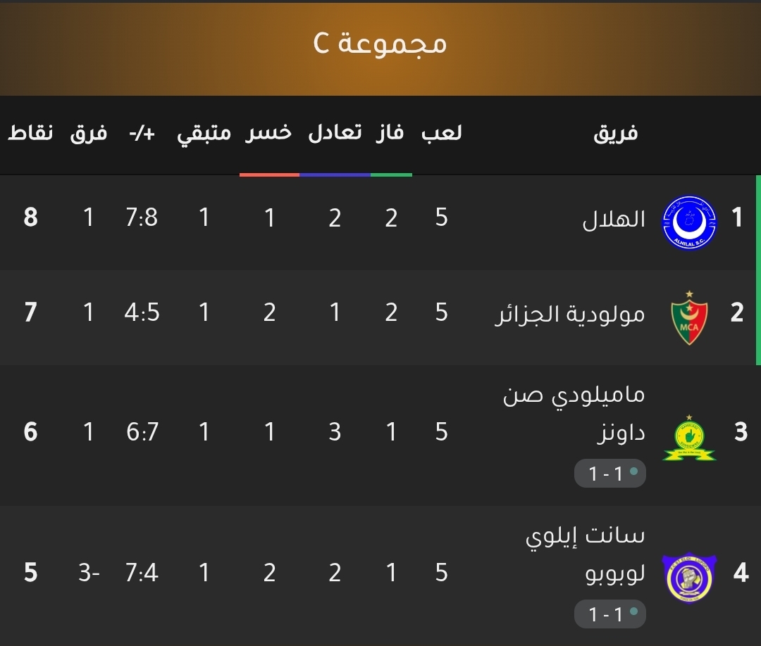 ترتيب المجموعة C بعد اكتمال الجولة الخامسة: الهلال 8 نقاط، مولودية الجزائر 7، ماميلودي صانداونز 6، سانت إيلوي لوبوبو 5. هذا يعني أن المولودية تدخل الجولة الأخيرة وهي صاحبة أفضلية بسيطة، لكنها ليست كافية لضمان التأهل دون نتيجة إيجابية.