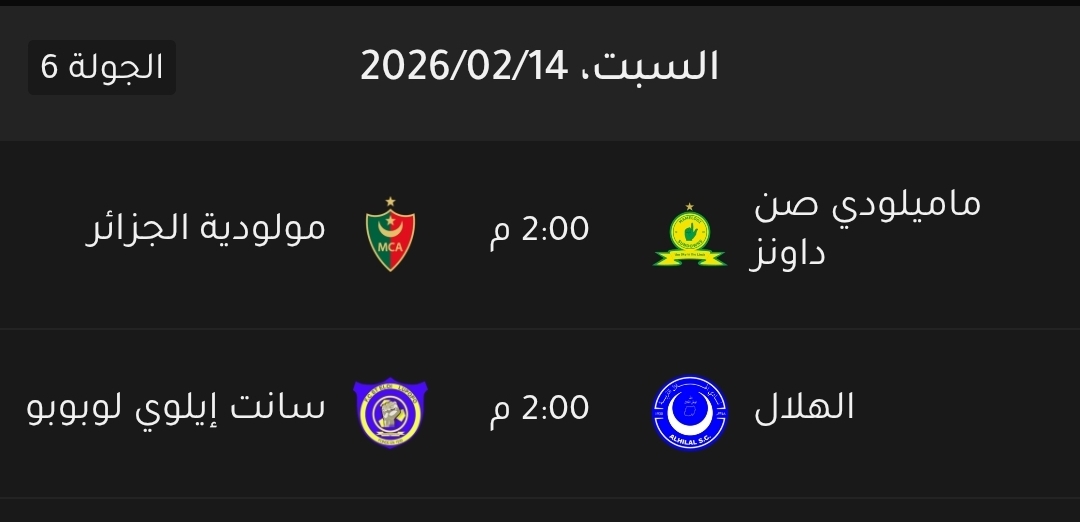 الجولة السادسة تُلعب بمباراتين متزامنتين حسب الصورة: مولودية الجزائر–ماميلودي صانداونز، وسانت إيلوي لوبوبو–الهلال، وكلتاهما على الساعة 14:00. لذا فإن أي تعثر للمولودية (خسارة) سيجعل نتيجة لوبوبو–الهلال مؤثرة جداً في تحديد صاحب البطاقة الثانية.