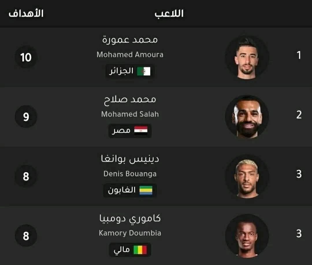حسب الترتيب الرسمي للهدافين، يتصدر عمورة القائمة متقدماً على نجوم القارة السمراء: