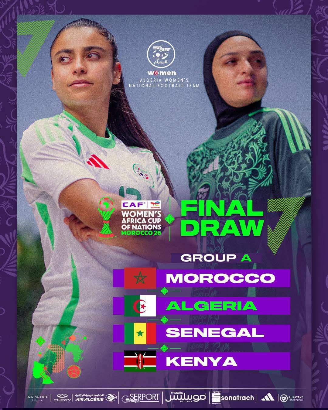 شهدت عملية سحب القرعة النهائية اليوم في الرباط وضع “الخضرات” في المجموعة الأولى A إلى جانب المغرب (المضيف)، السنغال، وكينيا، مما يُعيد الصدام مع الجار المغربي في سياق قاري ساخن، وتُقام البطولة في ملاعب الرباط (مولاي الحسن والمدينة)، الدار البيضاء (العربي الزاولي)، وفاس (المركب الرياضي)، لتصبح هذه النسخة السابعة للجزائر والثانية متواصلة بعد إنجاز ربع النهائي في 2024.