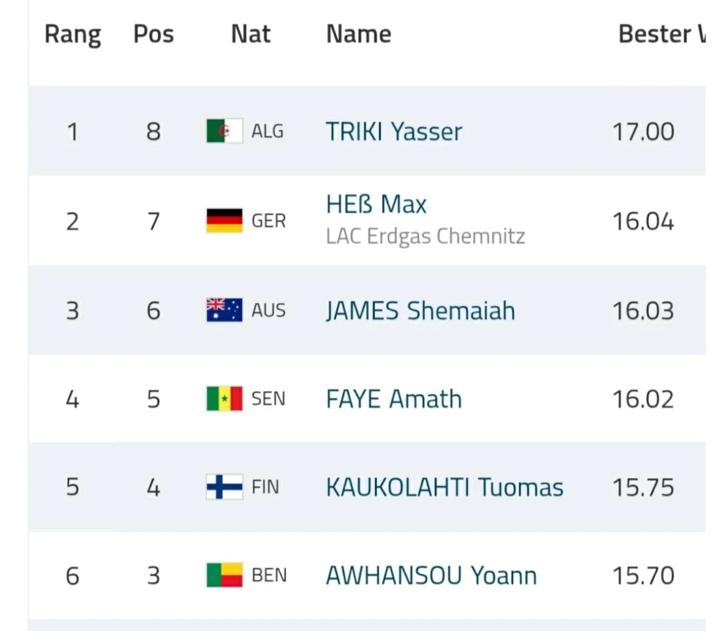 سجل البطل الجزائري ياسر تريكي قفزة بلغت 17 متراً في ملتقى برلين لألعاب القوى – السلسلة الفضية، مما مكنه من الظفر بالميدالية الذهبية، في إنجاز يؤكد استمرار تألقه على المستوى الدولي ويرفع اسم الجزائر عالياً في محافل ألعاب القوى الأوروبية والعالمية.