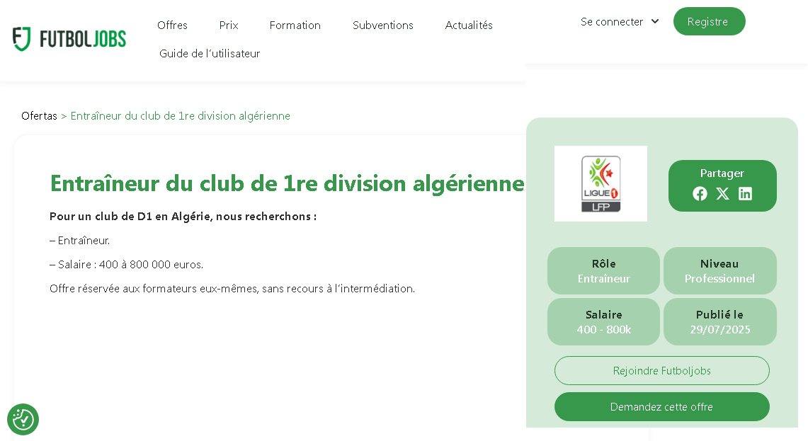 تكسر إدارة نادٍ جزائري ينشط في الرابطة المحترفة الأولى لكرة القدم الصورة النمطية للتعاقدات التدريبية، عندما قررت ـ للمرة الأولى في تاريخ الدوري المحلي ـ نشر إعلان رسمي على منصة توظيف رياضية عالمية futboljobs تستقطب آلاف المدربين من القارات الخمس.